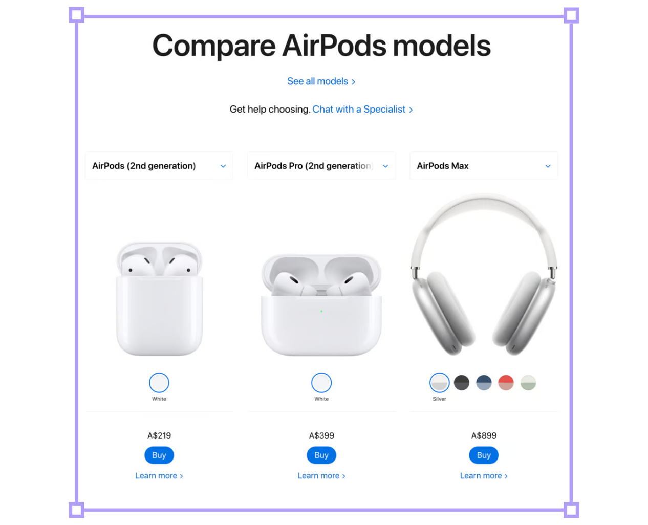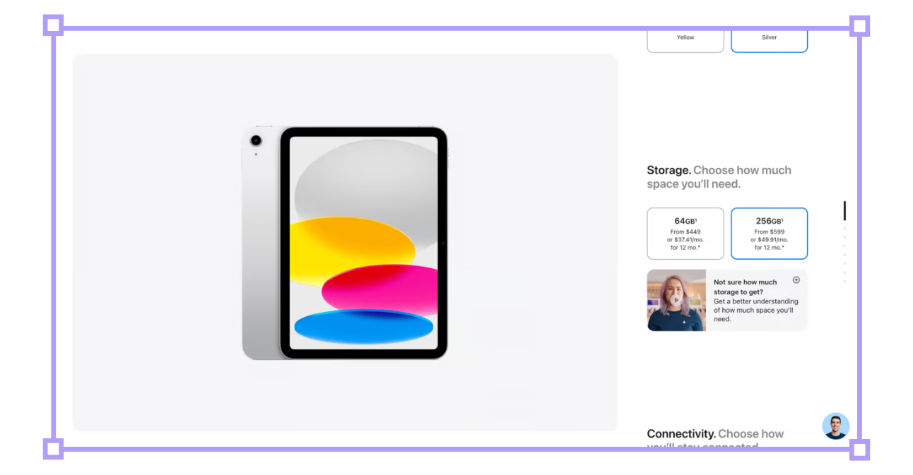 Due to the âCenter-Stage Effectâ, youâre likely to initiate your purchase flow with the 10th Gen iPad.After choosing a colour, youâre asked to âChoose how much space youâll needâ: 64GB or 256GB.For 4x the storage, itâs just an extra $150.One scroll later, you must âChoose how youâll stay connectedâ: Wi-Fi only, or Wi-Fi + Cellular.Again, another $150.Each upsell is introduced one-by-one, taking up the entire viewport, rather than all at once to gauge them holistically.As you assess each incremental upsell, "Commitment Bias" stops you from reverting decisions you previously committed to.Whether you picked extra storage or cellular connectivity, it wonât take long to realise that the extra $150 youâve mentally parted ways with could instead cover upgrading to the iPad Air.When evaluated against the equally-priced storage or cellular add-ons, getting the Air feels like a no-brainer.